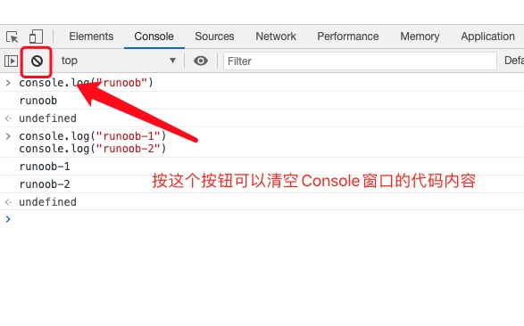 上图中我们在 > 符号后输入我们要执行的代码 console.log("runoob"),按回车后执行。